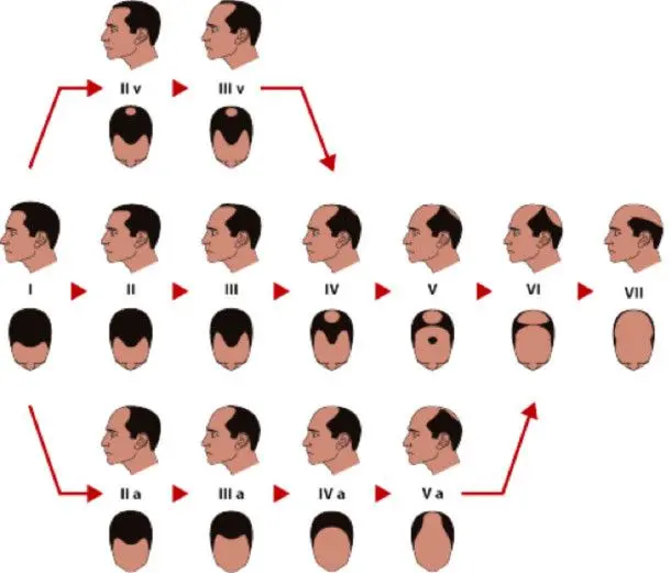Tipo V: Las zonas de la coronilla y de la frente están separadas solamente por una región estrecha. Vista desde arriba, la zona que aún conserva pelo dibuja la forma de una herradura (también en los tipos VI y VII).