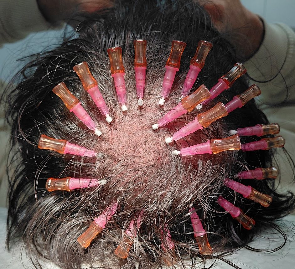 Con microagujas estériles (normalmente 29G), los hilos se colocan en las capas adecuadas del cuero cabelludo.